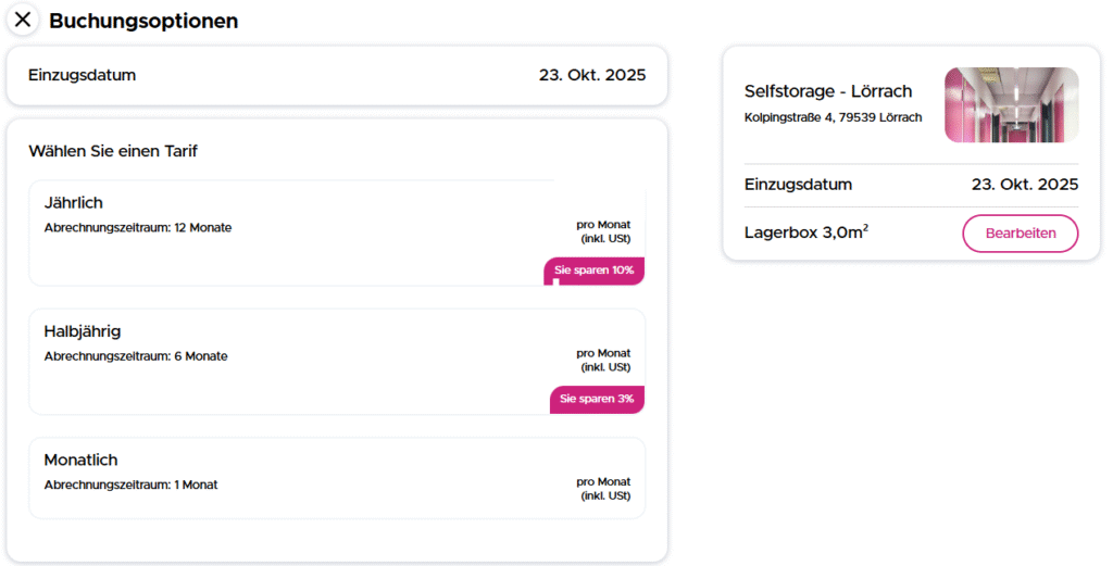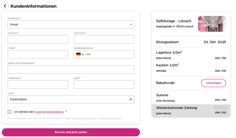 Tragen Sie Ihre persönlichen Daten ein und wählen Sie Ihr bevorzugtes Zahlungsmittel – schnell, sicher und verschlüsselt. Damit ist Ihre Buchung garantiert und Ihre Lagerbox direkt für Sie reserviert.